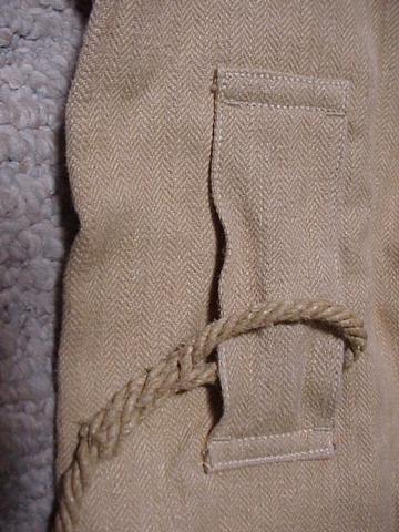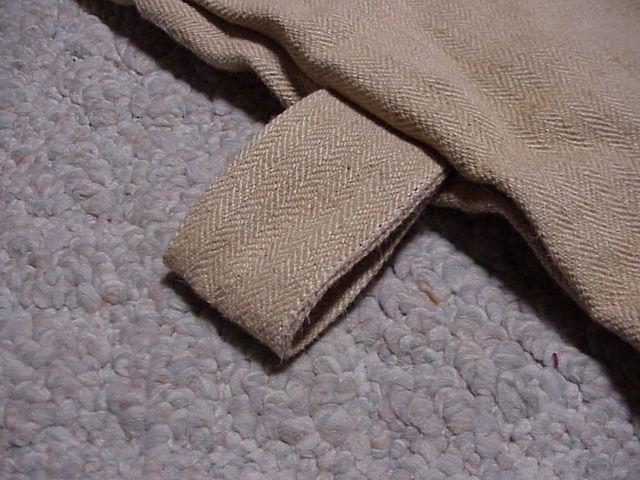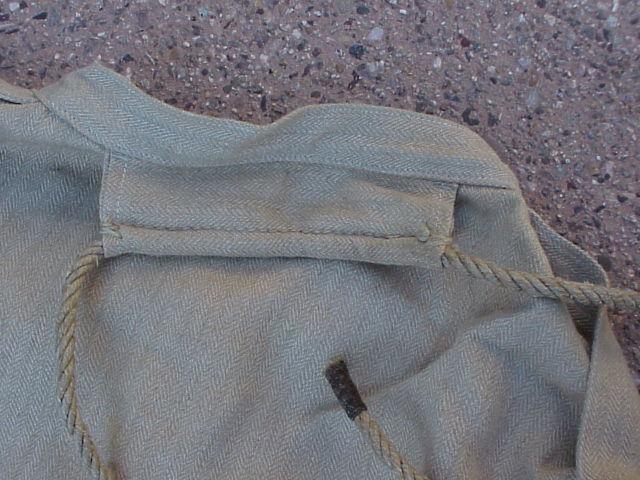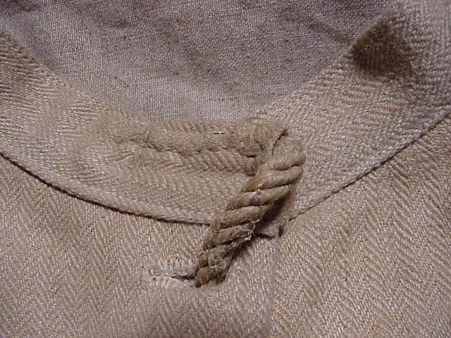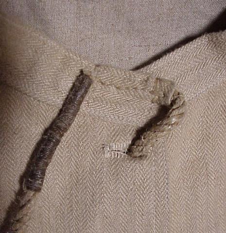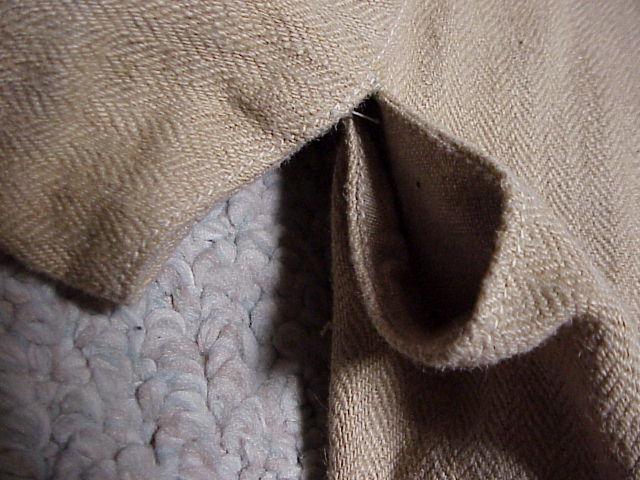 Fabric: The jacket is double thickness, made with two different types of woven material. Both seem to use the same fine but hard textured natural fibrous thread such as was used for mail sacks just before the introduction of man-made fibers. In Britain I'm told a mix of flax and jute was used (also known by the Bengali name of gunny).