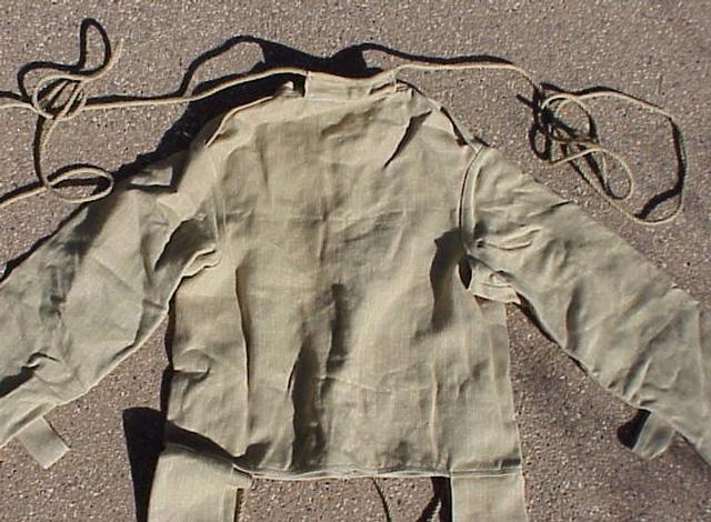 Over-elaborate, crude, inefficient, uncomfortable is the general reaction of people who field-tested it with me for the photo session. Designed by a civil servant with nothing better to do rather than somebody experienced in handling mentally disturbed people. Certainly a prison rather than hospital concept. Probably manufactured for punishment rather than simple restraint. General design is, apart from the very unusual two-strand fabric tails attached to the bottom hem at either side of the body, a basic front-opening short coat with rounded closed-end baggy sleeves.