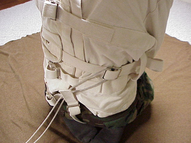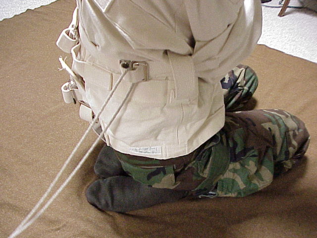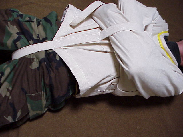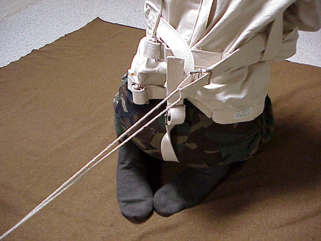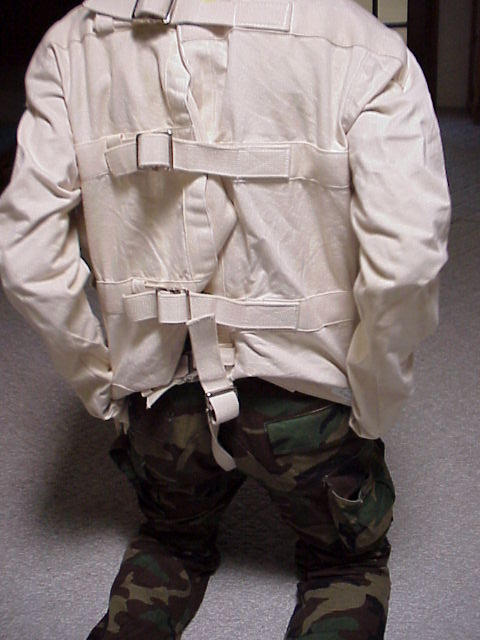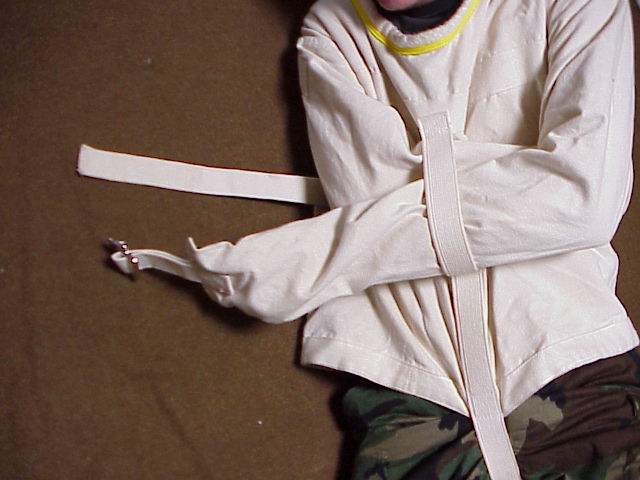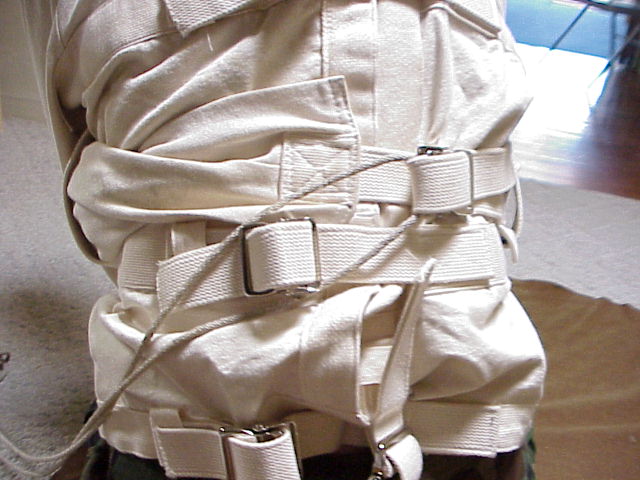 Straitjacket over my head, I put my left leg through the crotch strap