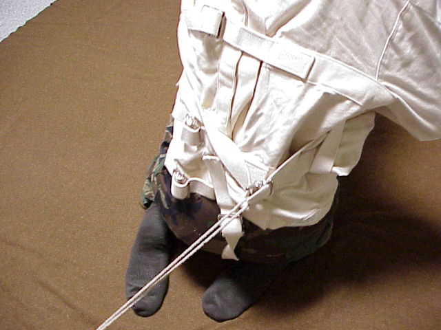 Oops. I need to back up. Off with the Straitjacket, a little prep work was needed. A rope, 10 maybe 15 feet long with both ends tied near the same point, a ring in the wall or a heavy chair will do nicely. I have a ring attached to the wall. This forms a big loop. This rope will be used to tighten up the arms, without using my hands. With this preparation done, I slide the jacket back over my head. (I really do this in the right order, it just doesn't make much sense to mention it first.) On to the hard part, getting the arm strap buckled and tightened.
